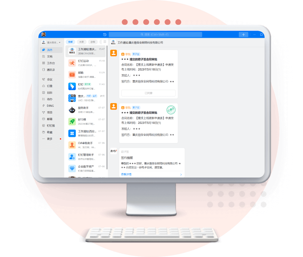 君子签在线电子合同签约平台钉钉微应用可以与钉钉审批、钉钉文件等应用功能进行对接融合,实现合同发起、合同签署、用印申请、用印审批等签约流程的自动化和智能化。同时,相关签约、用印、审批等业务操作还可以通过钉钉消息实时通知,签署效率更高。