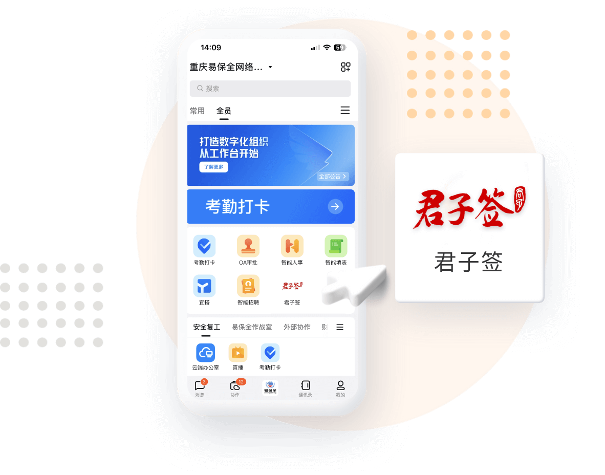 君子签在线电子合同签约平台,为解决中小微企业在传统线下合同签署中所面临的普遍性痛点,深度融合钉钉打造的一款标准电子合同签约系统; 主要为用户提供签约前、签约中、签约后三个环节过程中的身份认证、数字证书、电子合同发起、 电子合同在线签署、时间戳、区块链存证、电子合同管理、在线司法等服务; 与钉钉深度结合,签约消息钉钉实时通知,打通钉钉审批流,全流程不出钉钉,一站解决。